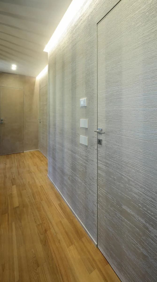 Le pareti del corridoio, e alcune porte, assumono rilevanza grazie al rivestimento “Zen” di Giorgio Graesan, dai toni colore in continuità con le scelte progettuali.