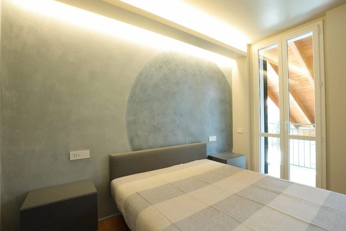 La parete principale, appoggiata alla testata del letto, colpisce per la decorazione circolare in “pelle di elefante” (sempre di Giorgio Graesan), mentre le altre pareti regalano una resina decisamente elegante, questa volta a effetto “pietra levigata”.
