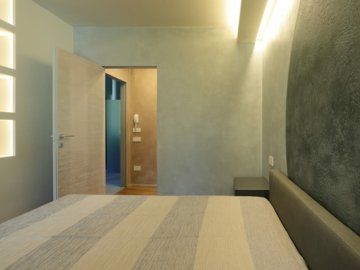 Infine, una parete divisoria, creata appositamente, separa la stanza da letto da una capiente cabina armadio (illuminata a led).
